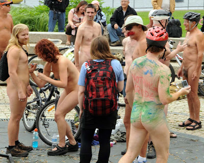 Wow, unless I saw it for myself I would not have believed it - World Naked Bike Ride (WNBR) in Toronto, in the photo above the group heads north on Yonge Street. The bikers began the event in Coronation Park, which is along the shores of Lake Ontario between the CNE and HMCS York, starting at noon. Some spent the time doing interviews and posing for pictures while others put on body paint.